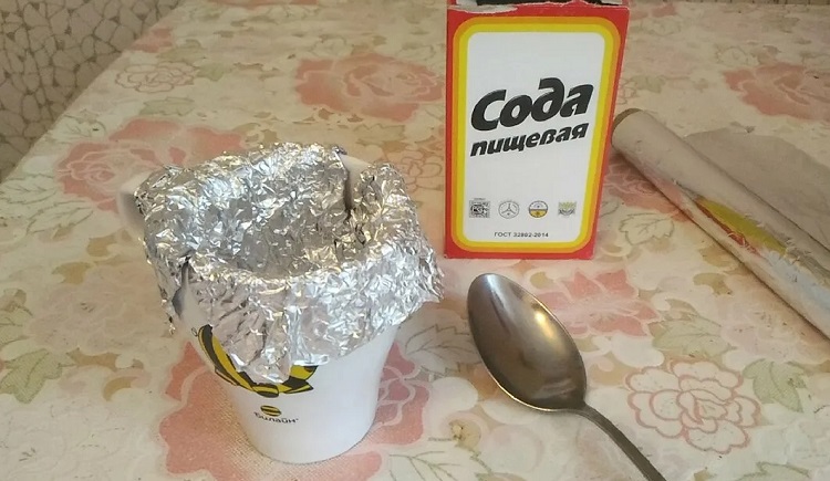 - Вначале выкладывают то, что необходимо очистить на лист фольги, далее насыпают соду и в завершении добавляют горячую воду.