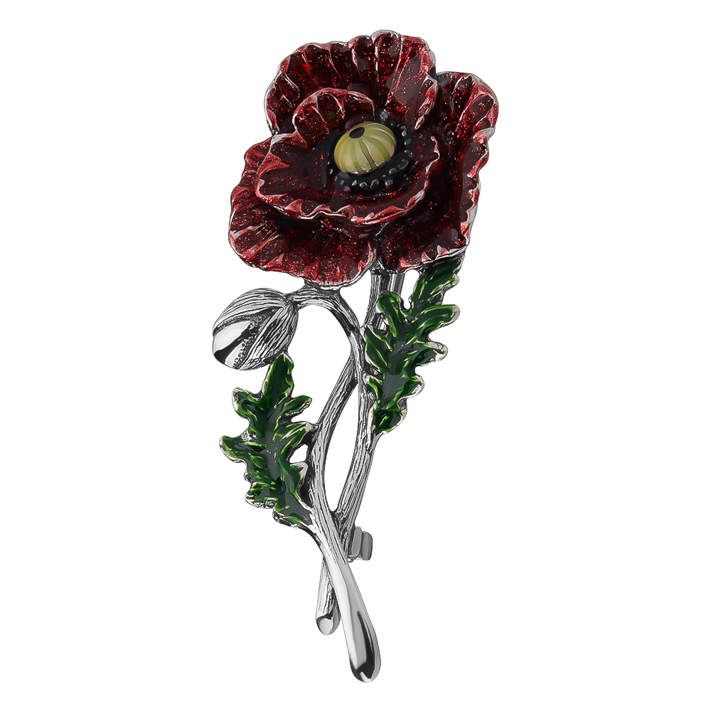 Изысканная брошь в форме крупного цветка мака — это не просто украшение, а настоящее произведение ювелирного искусства. Модель сочетает классическую благородность серебра и яркую выразительность художественной эмали, создавая неповторимый акцент в любом образе.