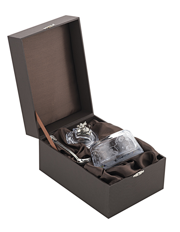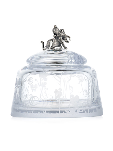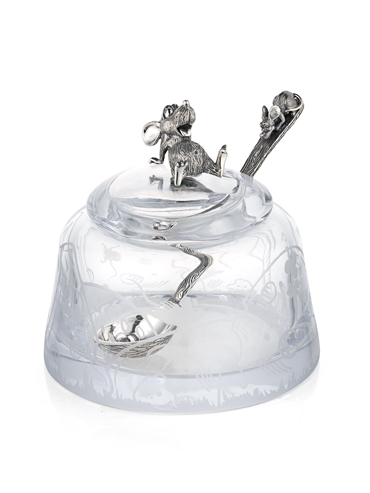 Емкость изготовлена из хрусталя ручной работы высшего качества, выполненного по технологии XIX века. Работа производится также в цветном хрустале. Украшена серебряными фигурками шуточных мышей. Один из них, уже наелся сыра и отдыхает, а второй, на ложке, только стремится в банку.