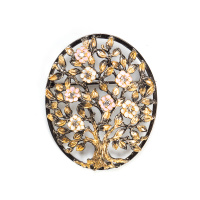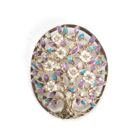 Если это "тема природы" - значит лёгкость , ажурность формы подчёркивается акварельными сочетаниями цветов эмали ("Дерево счастья", "Сумерки"). Если это крупные авангардные изделия, то чёткие геометрические линии окрашены в яркие контрастные тона с элементами витражной эмали ("Фараон", "Пузыри").