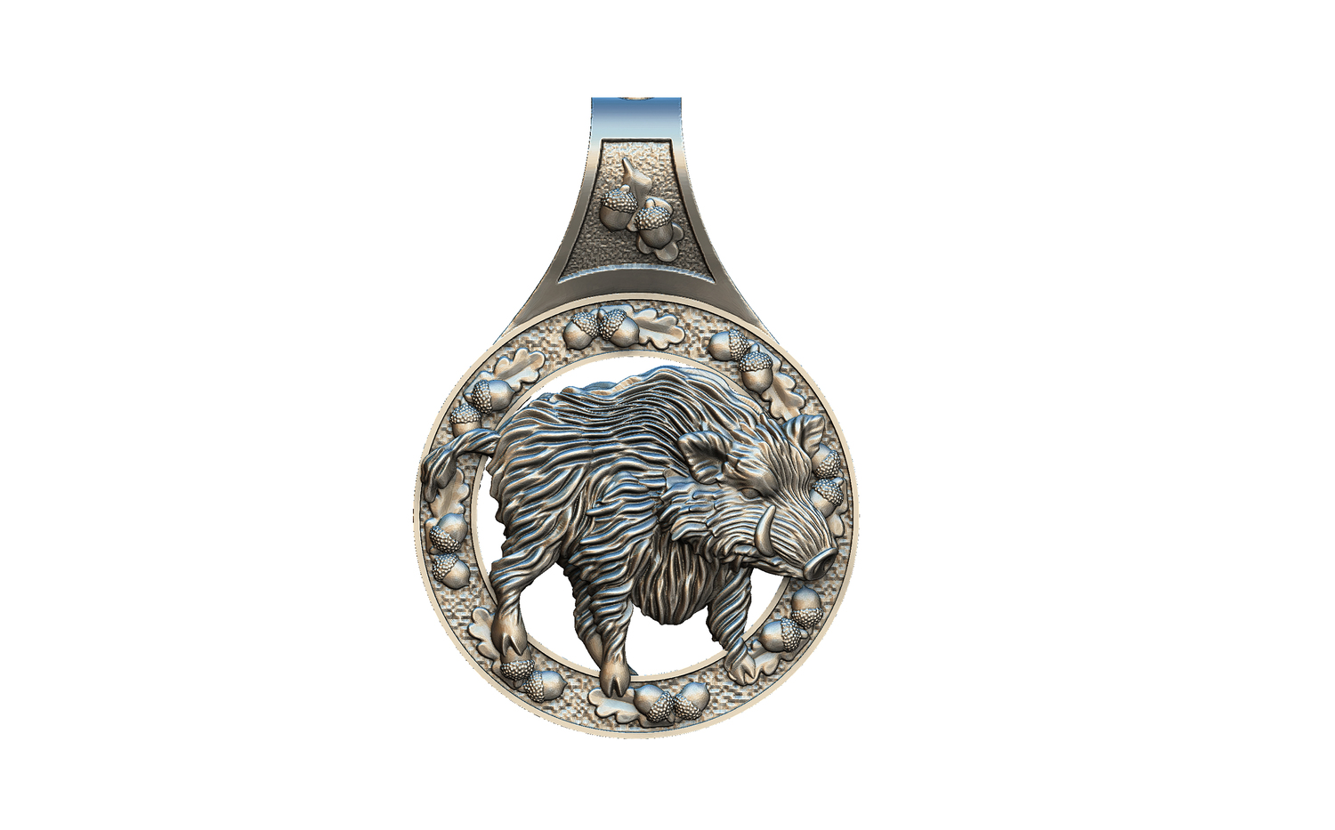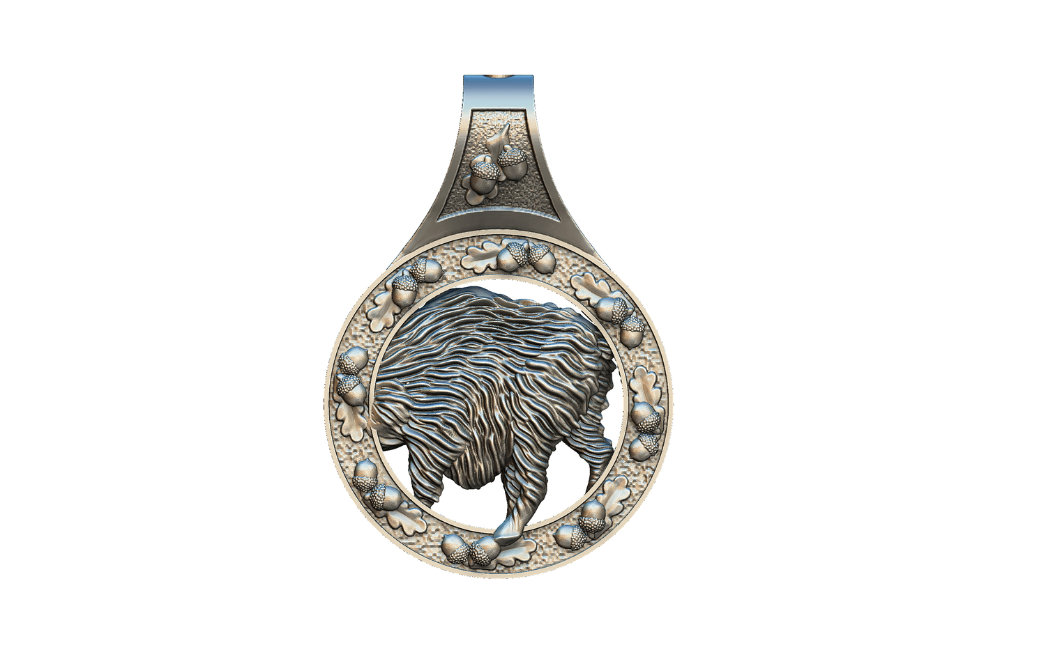 Для его изготовления применяется высококачественное серебро, при этом металл отличается благородной матовой поверхностью. Подвеска имеет ушко для шнурка, поверхность медальона рельефная и отличается тонкой детализацией. Изображение двухстороннее, круг и петелька декорированы изображениями желудей.