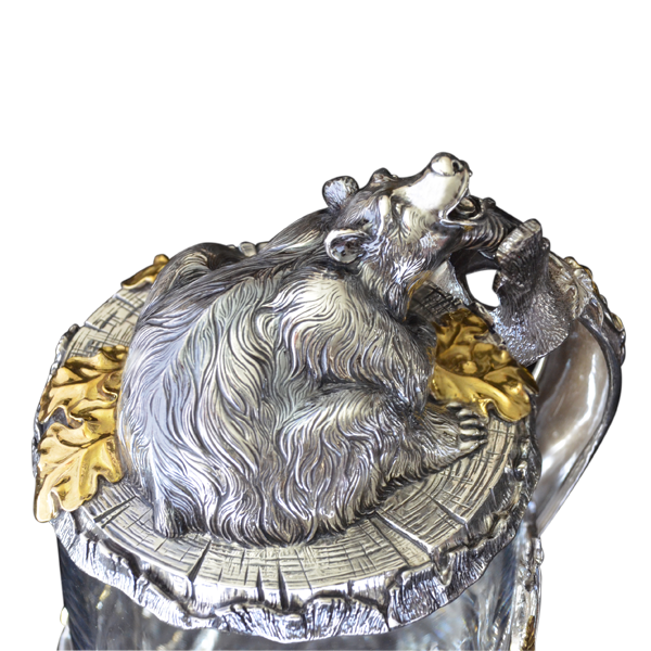 Основа пивной кружки представлена в виде большого пня, опутанного золочеными резными листочками хмеля. На нем красуется упитанный, холеный медведь, сжимая в лапах ботву от репы, играя на щепе и как бы ворча: « - Мужик, давай репу делить, мою долю подавай! - Ладно, медведюшка, давай делить: тебе вершки, мне корешки»