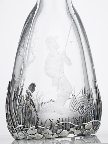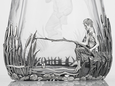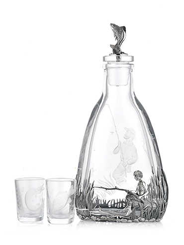 Водочный набор по рыбацким мотивам выполнен вручную из серебра и хрусталя. Состоит из массивного штофа и двух стопок со сложной гравировкой по хрусталю.