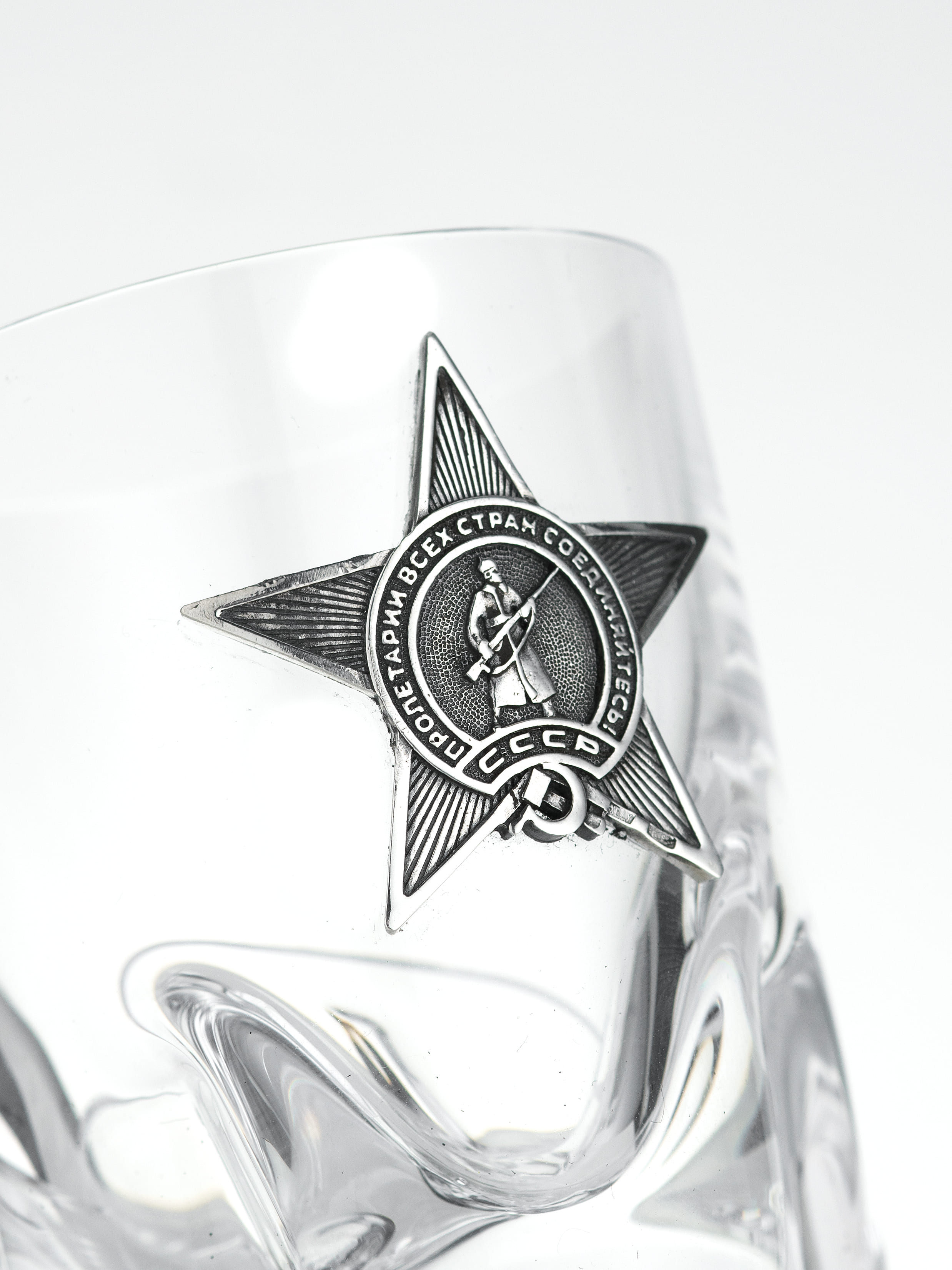 Каждая стопка, вмещающая 60 миллилитров, украшена гербом России ручной работы.