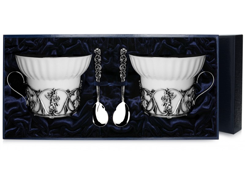 2 чашки чайные "Ангел" с ложками порадуют взгляд тонкими изображениями маленьких фигурок ангелов с дудочками. Ободок края чашек покрыт серебром. Комплект дополнен чайными ложками с витым растительным узором на рукоятках. Основания чашек и ложки выполнены из серебра 925 пробы. Набор упакован в элегантный подарочный футляр тёмно-синего цвета.