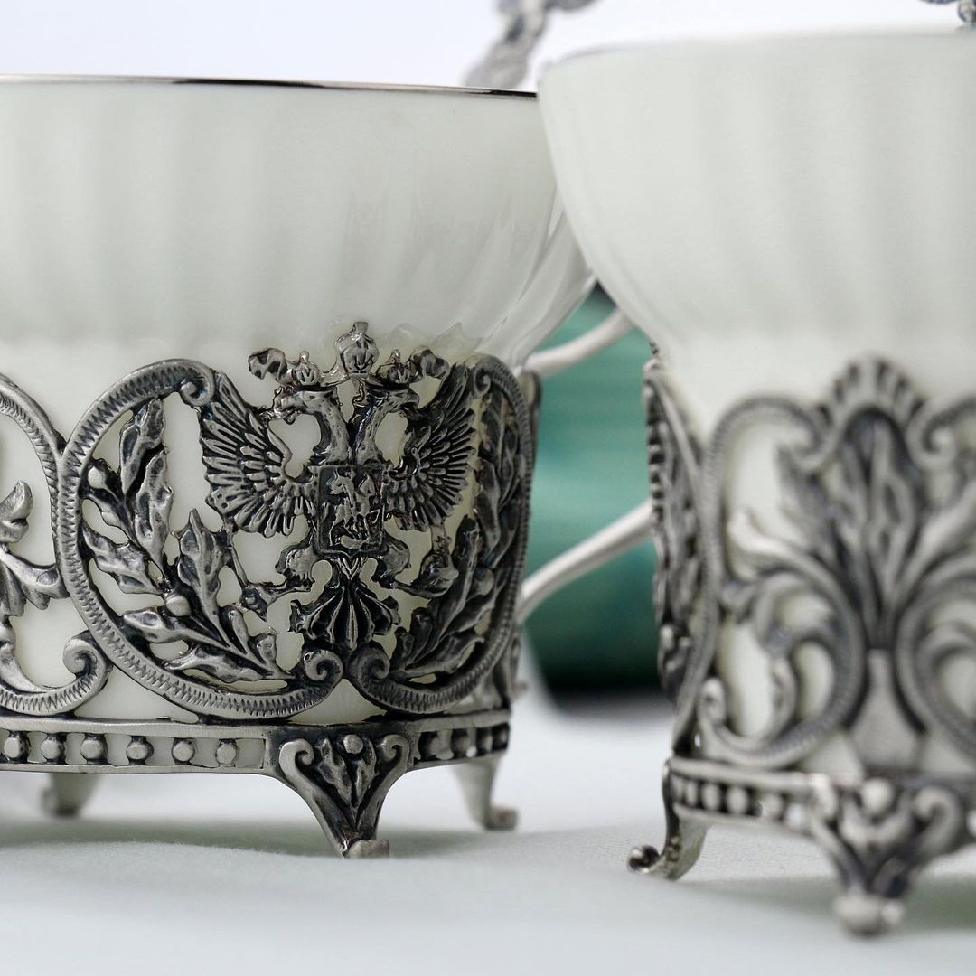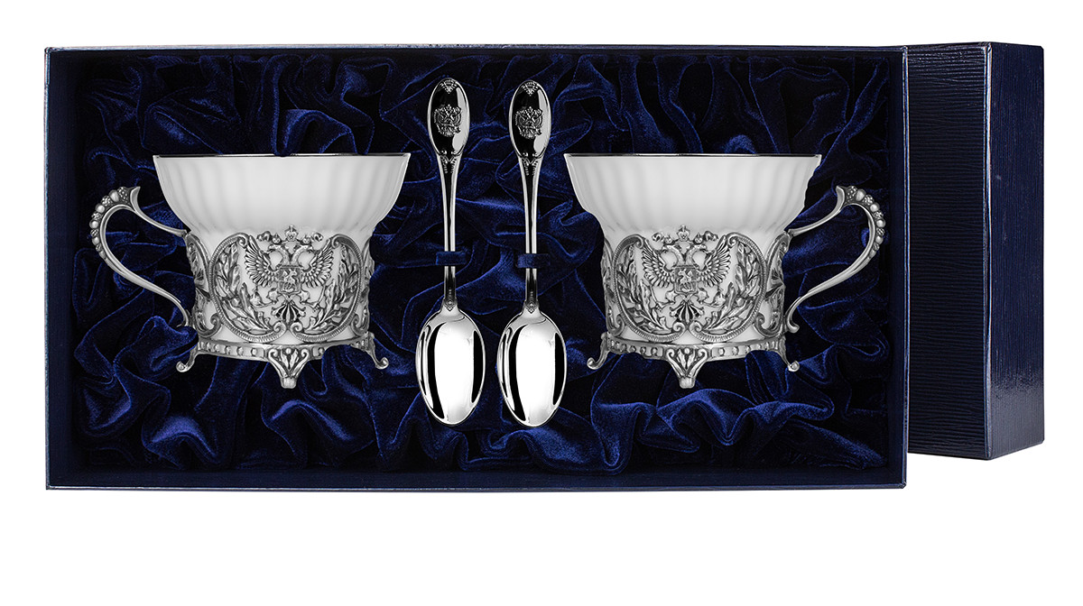 Фарфоровые чашки украшены серебряным ободком по краю и дополнены основаниями, стилизованными под двуглавого орла - герб Российской Федерации. Герб также нанесён на рукоятки ложек. В работе лучших мастеров ювелирной фабрики "АргентА" использовано серебро 925 пробы с чернением. Набор упакован в строгий подарочный футляр.