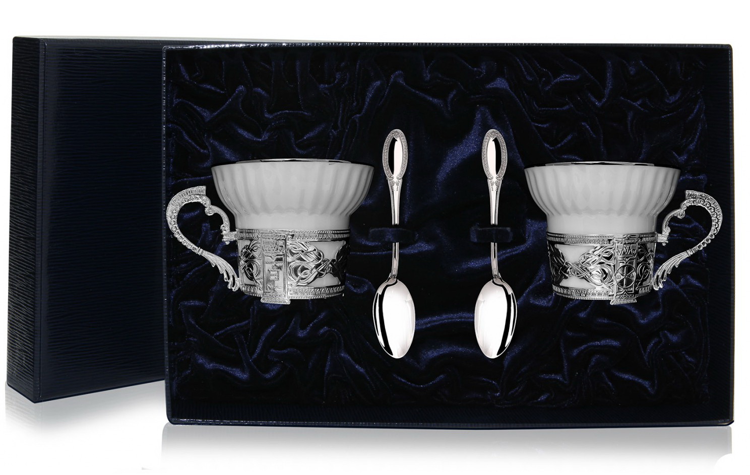 2 чайные чашки "Константин Великий" в комплекте с серебряными ложками способны задать особо торжественный тон встрече или домашнему застолью. Чашки с серебряными ободками и основаниями украшены изображениями профиля римского императора. Ложки из коллекции столового серебра "Император" идеально вписываются в комплект, форма их ручек перекликается с отделкой оснований чашек. Набор продаётся в удобном подарочном футляре.