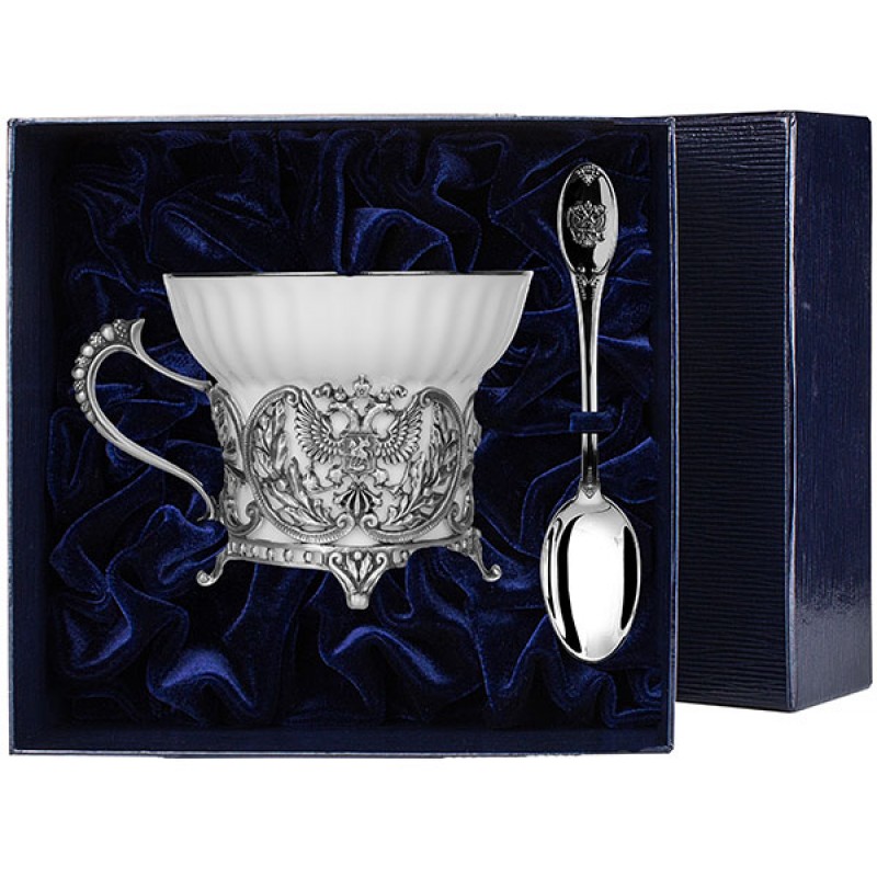 Белая фарфоровая чашка вставлена в массивный подстаканник из серебра 925 пробы с чернением. В комплект включена серебряная чайная ложка из коллекции "Единство", декором которой выступает изображение герба Российской Федерации на рукоятке.