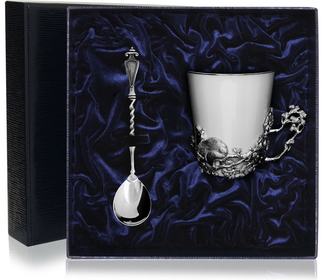 Чашка чайная "Куница" с ложкой представляют собой великолепный набор, способный потрясти воображение того, кто получит его в дар. Фарфоровая чашка с серебряной подставкой, на которой выполнены вручную витые узоры на тему фауны, а ручка напоминает веточку дерева, прекрасно подойдёт для праздничного стола и уютного домашнего чаепития. В синем футляре тёмного оттенка также представлена ложка для чая "Витая". Узоры серебряных изделий 925 пробы покрыты чернением.