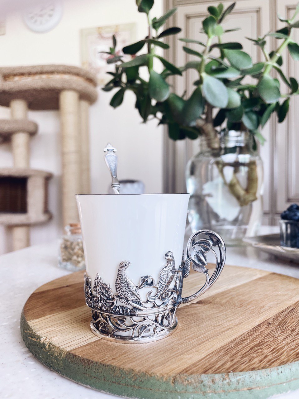 • Чайная чашка с серебром "Тетерев" с чернением - 1 шт. арт. 538ЧШ03006 Высота: 7 см. Объём: 150 мл. Диаметр: 8 см