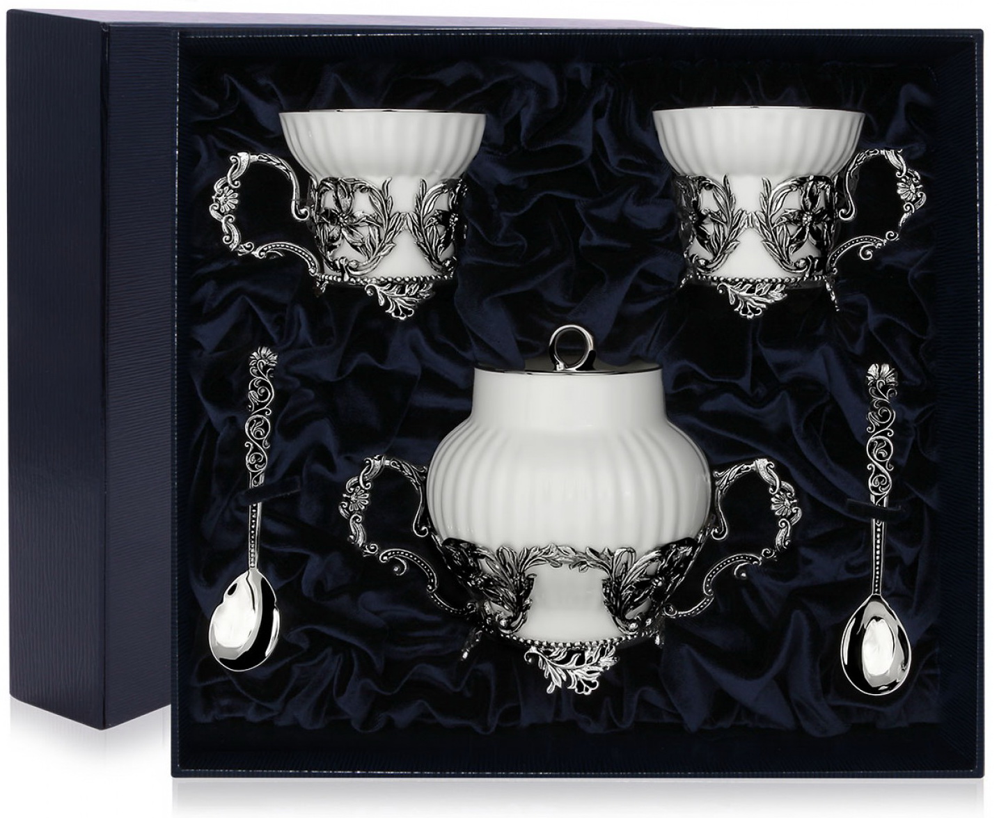 Набор "Симфония" для чая, в который входят две чашечки с серебряной узорчатой подставкой с ручкой, две ложки "Подарочные" и фарфоровая сахарница с серебряными крышкой и подставкой. Все предметы превосходно смотрятся на столе и создают торжественную атмосферу. Набор упакован в подарочный футляр синего цвета.