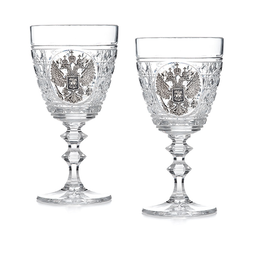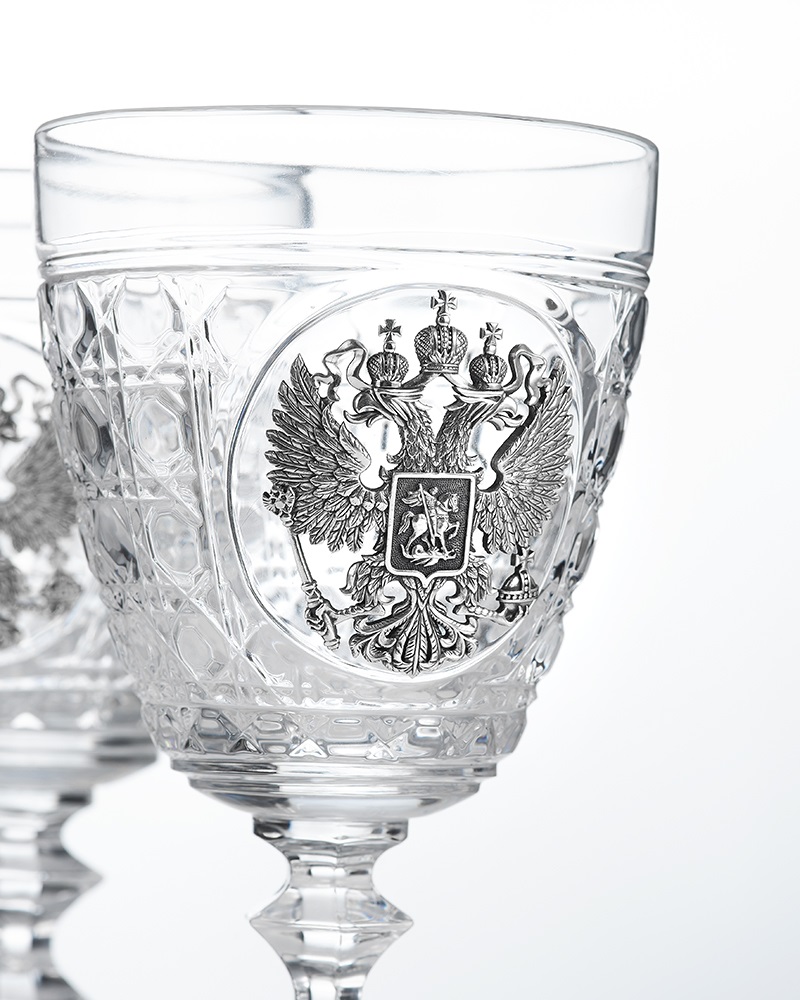 Каждый бокал, вмещающий 460 миллилитров, украшен гербом России.