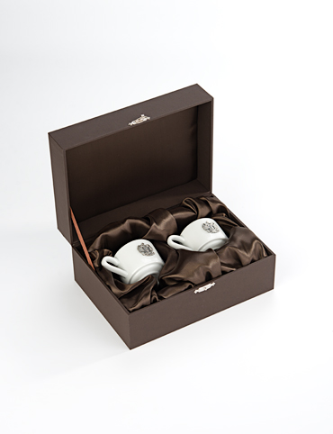 Кофейная пара «Держава» выполнена из фарфора и украшена серебром. Чашки красиво упакованы в подарочный футляр и транспортную коробку.