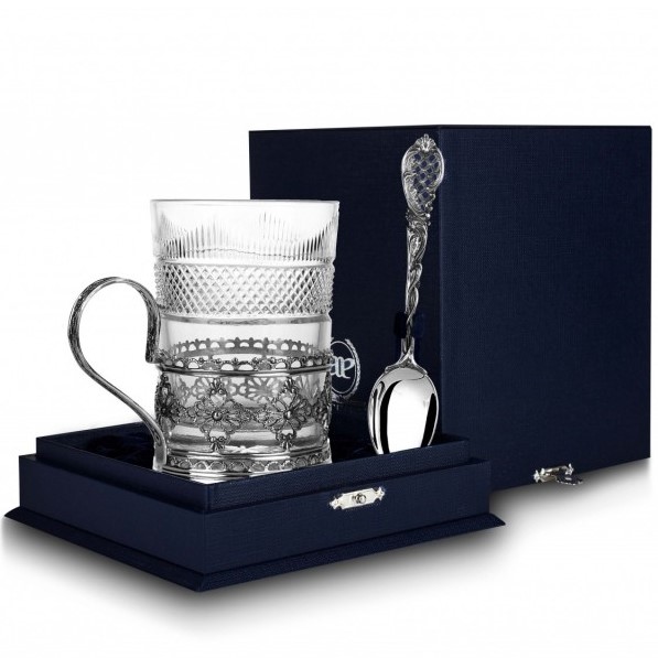 Серебряный литой подстаканник "Ажур" с чернением и серебряной ложкой "Барокко" искусно выполнены из серебра 925 пробы, а также украшены чернением, придающим комплекту изысканный и аристократичный вид. Предметы набора упакованы в плотный футляр для перевозки. Подстаканник украшен кружевными узорами, которые ассоциируют вледальца набора с высшим сословным классом . В комплект также входит прозрачный стакан, выполненный из хрусталя.