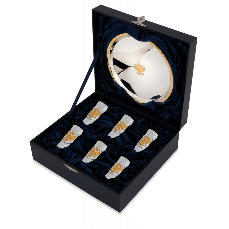 Серебряный набор "Герб" с позолотой может послужить эксклюзивным подарком коллеге по госслужбе, военнослужащему, руководителю компании, педагогу, завучу или директору школы, и любому, кто любит нашу Отчизну.