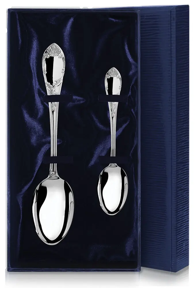 Внутри элегантного синего футляра с атласной подушкой расположились две ложки - столовая и чайная, на рукоятках которых изображены классические узоры в стиле барокко.