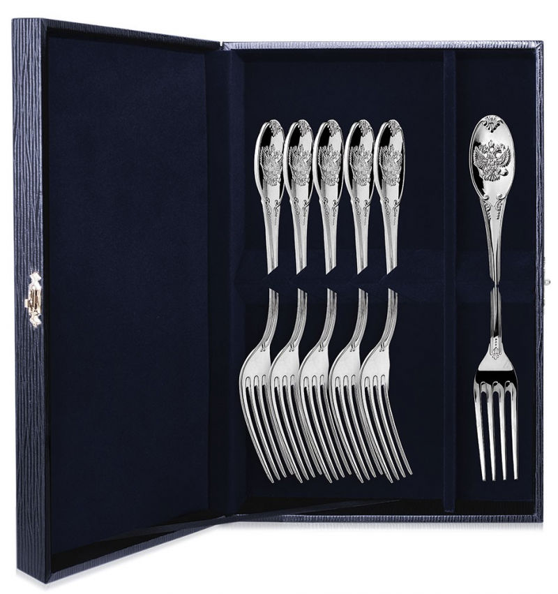 Серебряный набор "Единство"- это 6 столовых вилок, отличительной особенностью которых является уникальный узор - двуглавый орел, который придает торжественный, а также особенно официальный вид приборам. Безупречный подарок для родных, деловых партнеров, а также близких друзей.