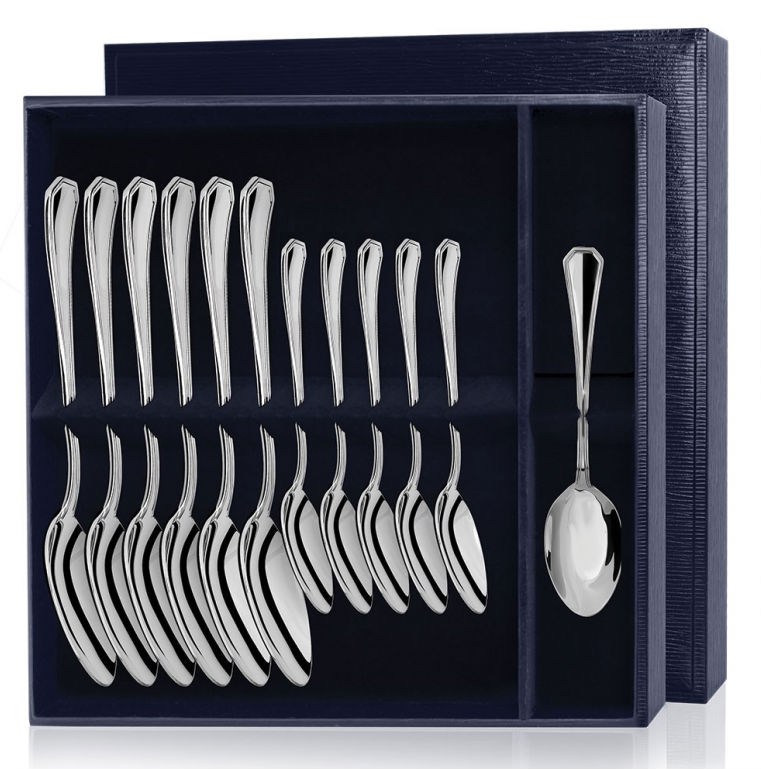 Внутри элегантного синего футляра с защелкой располагается двенадцать предметов столового серебра - 6 чайных, 6 столовых ложек. Рукоятки каждого прибора обрамлены аккуратной полосой, которая указывает на истиную элегантность набора.