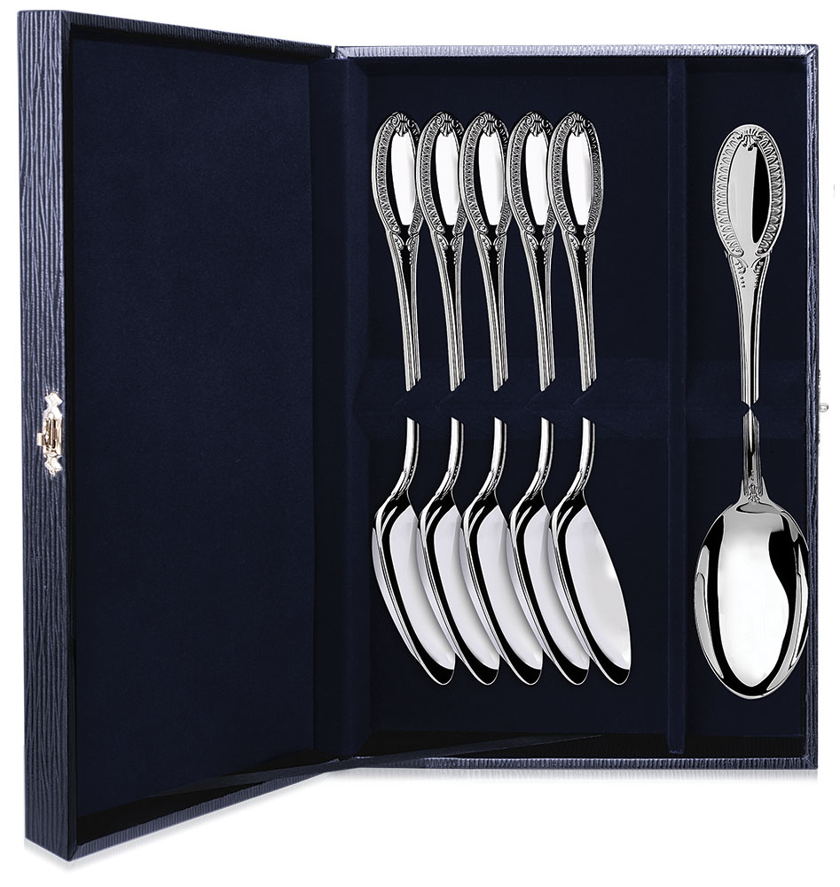 Данный серебряный набор рассчитан на 6 персон. Используя ложки из набора, любое застолье станет эстетически приятным процессом. Шесть столовых ложек станут прекрасным памятным подарком для родных, родственников и коллег. Рукоятка предметов украшена узорами в классическом стиле.