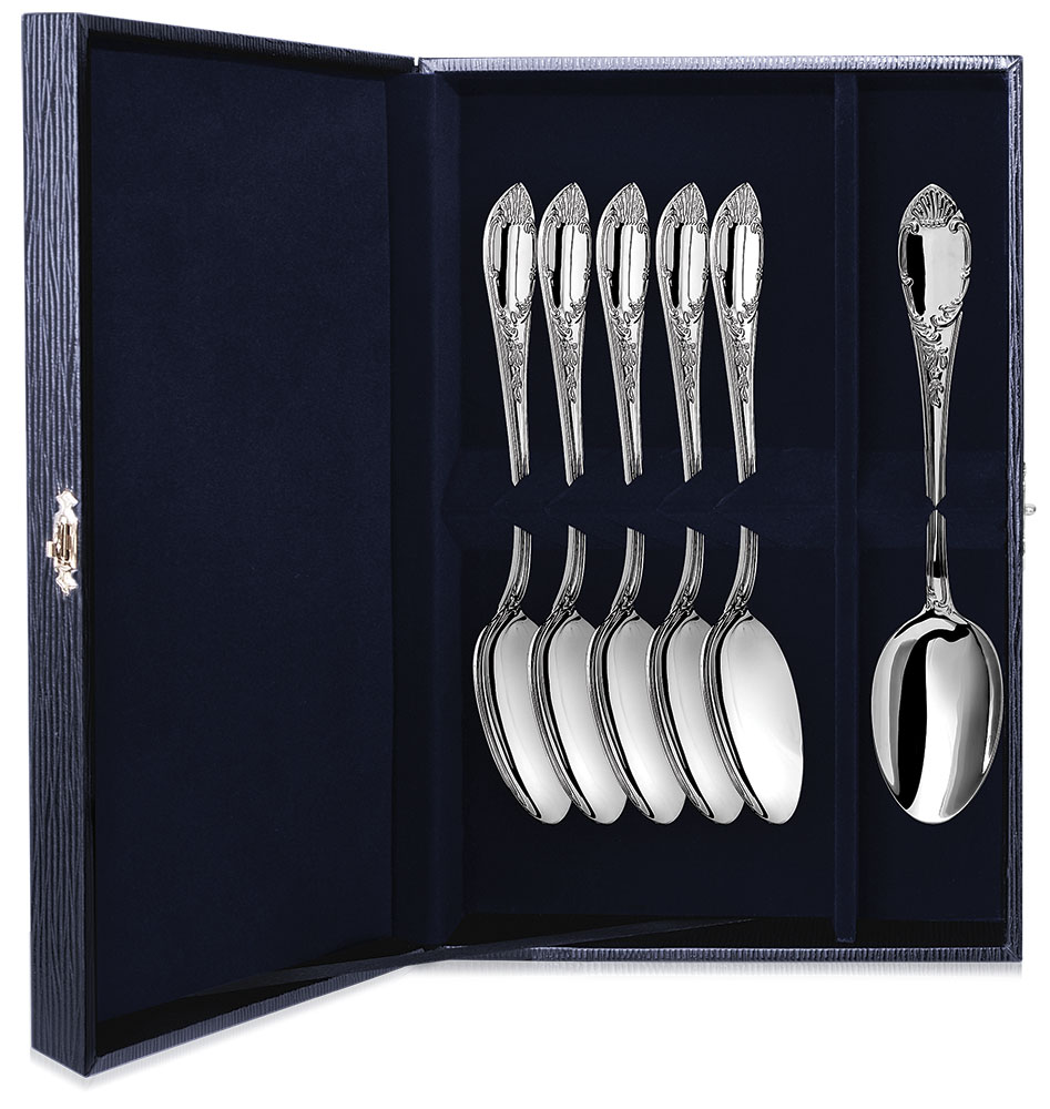 Серебряный набор "Престиж" включает в себя 6 столовых ложек, выполненных из серебра и украшенных аккуратными, классическими узорами по всему контуру рукояток.