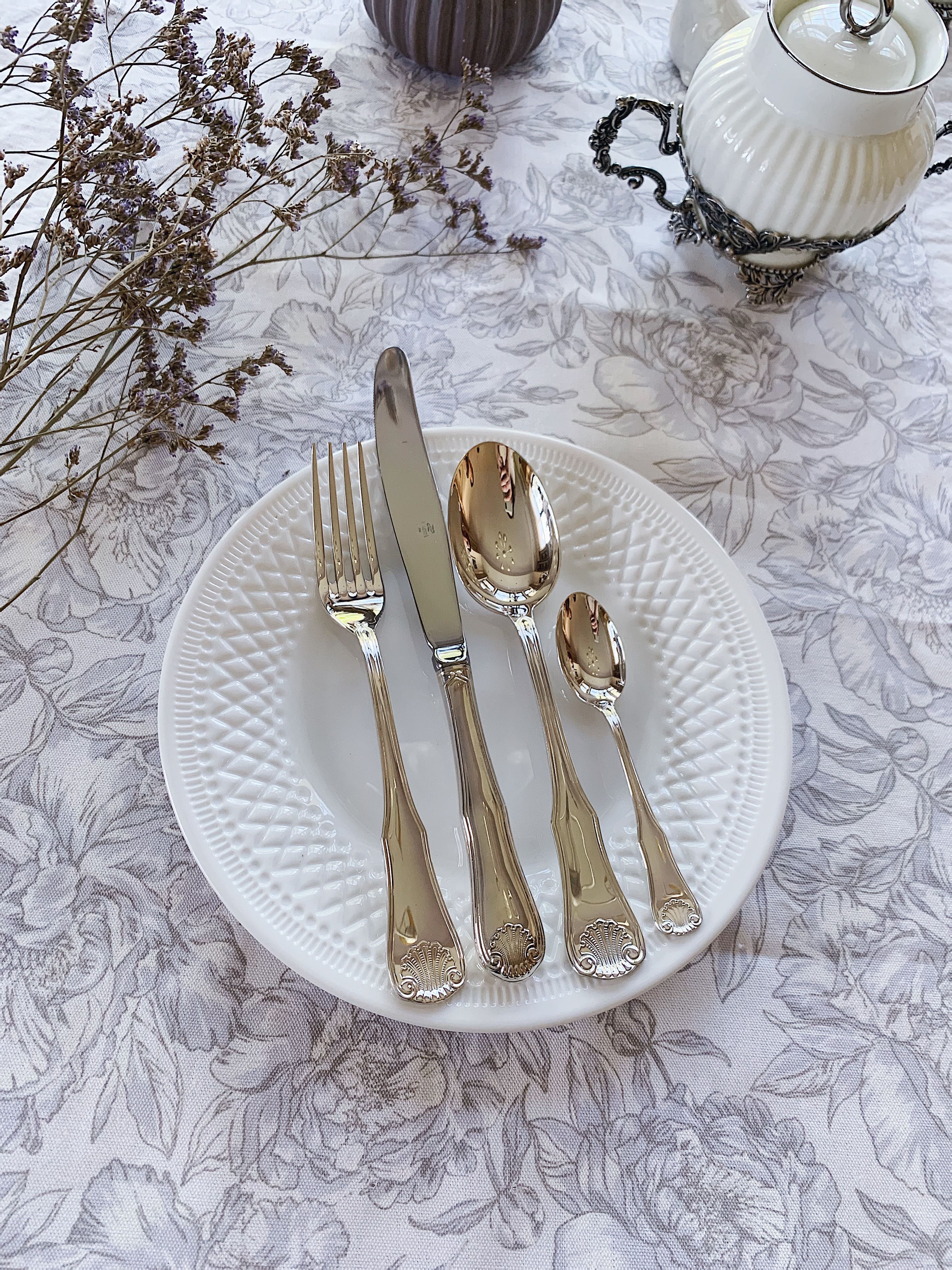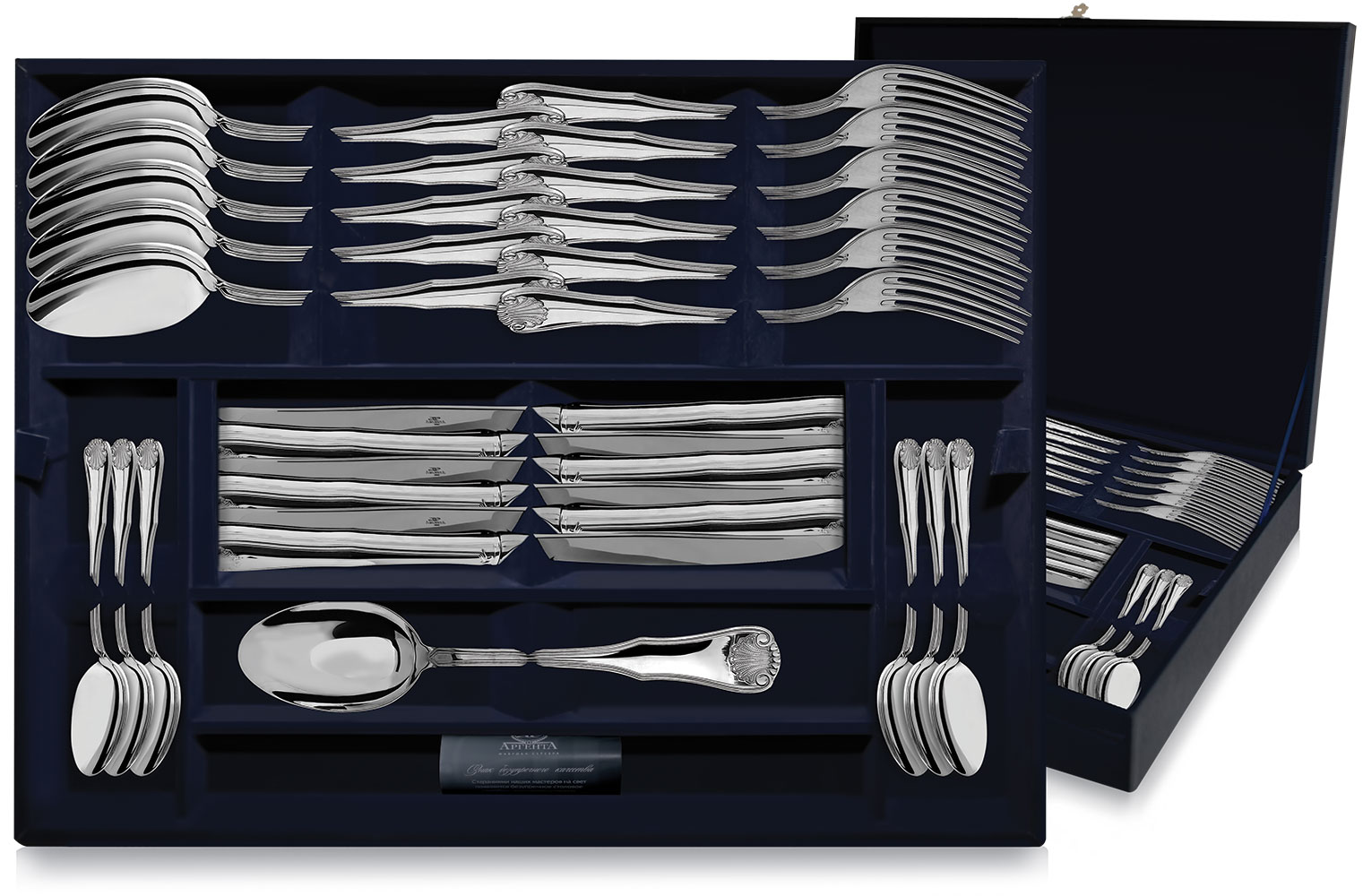 Серебряный набор столовый на 6 персон "Визит" представляет собой полный комплект столового серебра для сервировки стола. Внути футляра расположены 24 предмета, выполненных из серебра 925 пробы - по шесть вилок, ножей, столовых и чайных ложек. Ручки приборов украшены узором в виде ракушки.
