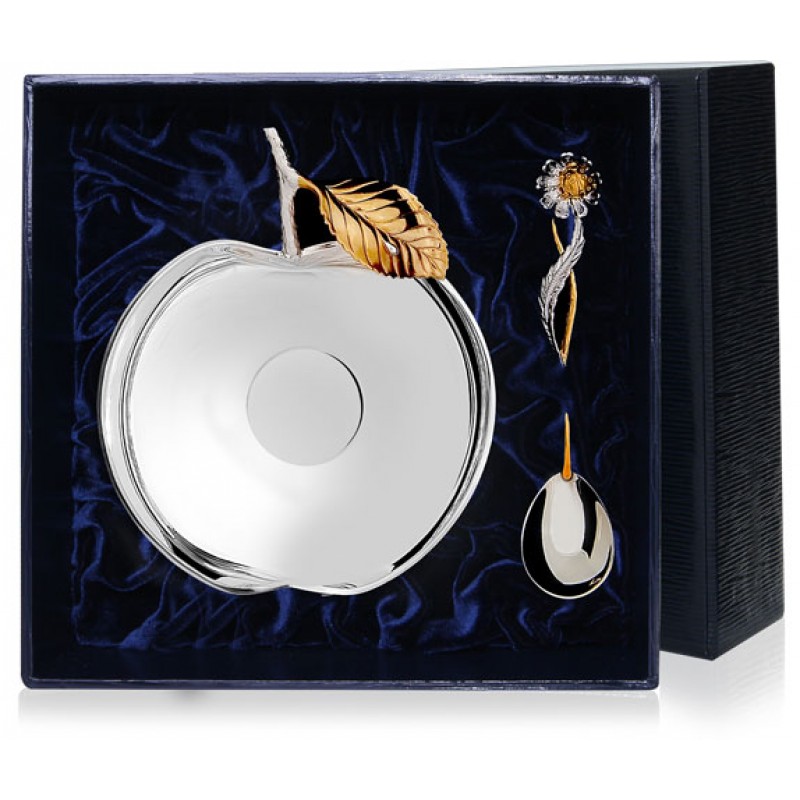 В составе комплекта находятся серебряная тарелка в виде яблока с аккуратным позолоченным листочком, а также чайная ложечка. Рукоятка ложки украшена ромашкой, внутри которой ярко светит позолота. Станет незабываемым подарком по любому поводу.