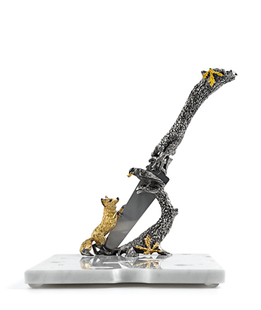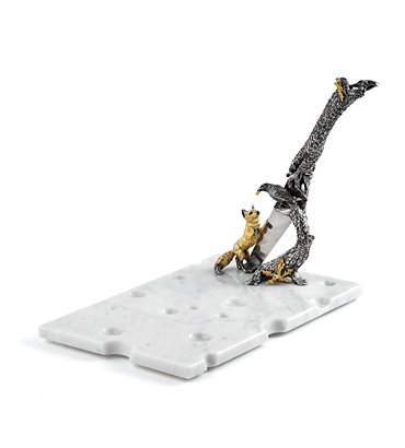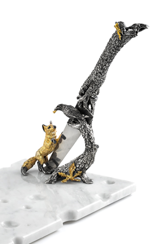 Премиальный набор для нарезки и подачи сыра по мотивам басни И. А. Крылова укомплектован специальным голландским ножом для полумягких сортов сыра. Разделочная доска выполнена из натурального мрамора, дорогого материала обладающего исключительными бактерицидными свойствами. Такая доска прочна и долговечна, легко моется и не впитывает запахи и влагу. Выложенные на мраморной доске сыры дольше остаются свежими.