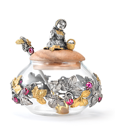 Сосуд сахарницы «Земляника» выполнен из термостойкого стекла украшенного серебром. Крышка изготовлена из дуба, пропитанного для придания водоотталкивающих свойств дереву, льняным маслом. Ягодки сделаны из девяти корунд-рубинов изящной огранки. Сахарница снабжена ложечкой. Детали выполнены вручную и в полной мере передают атмосферу русского леса, с его вкусными, спелыми, обильными дарами. Произведение займет достойное место в коллекции серебра или станет прекрасным подарком для ценителей ювелирного искусства.