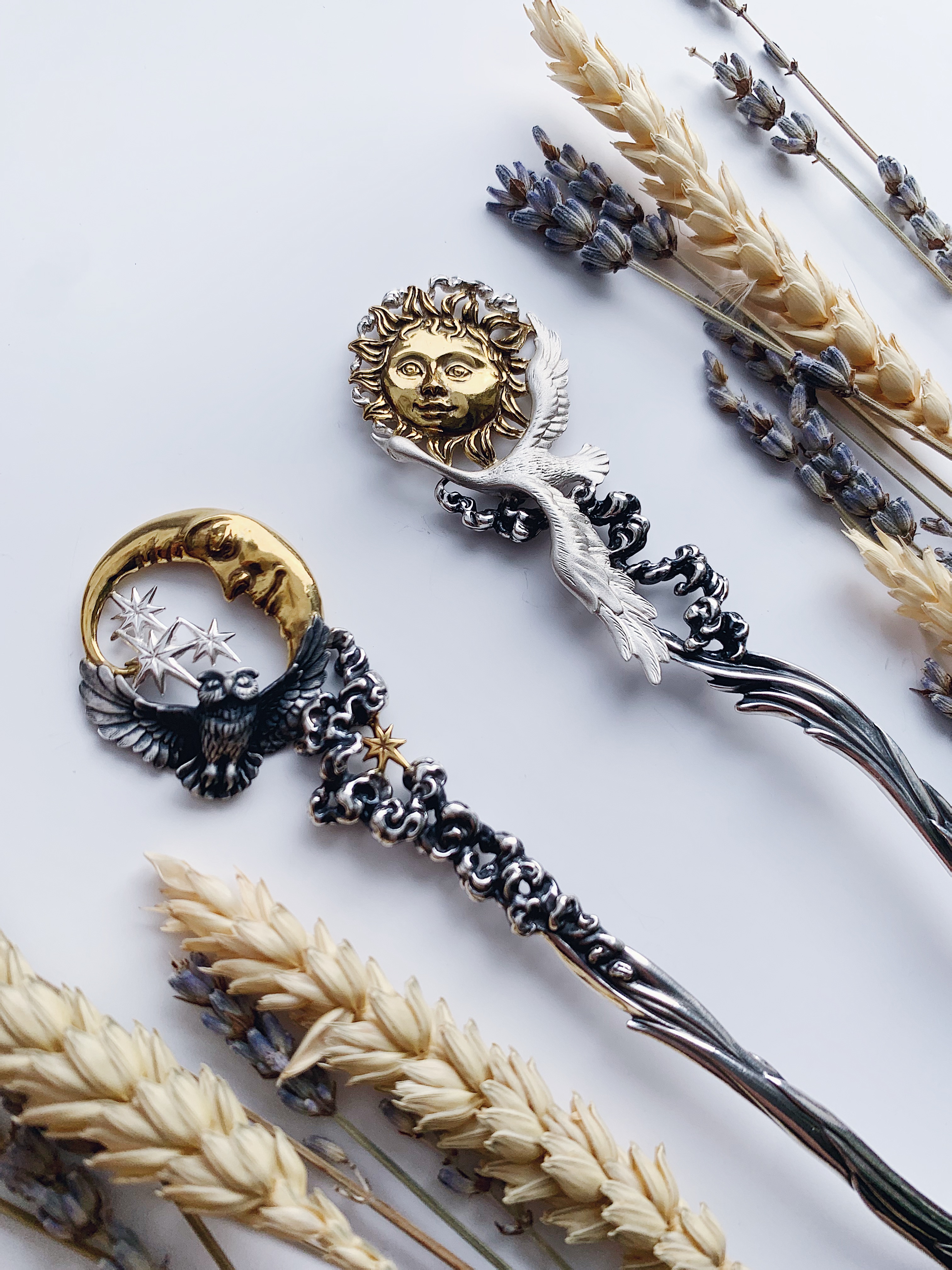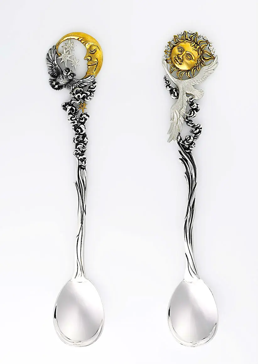 На создание второй ложки «Ночь» дизайнеров вдохновило не менее прекрасное, но более таинственное ночное время. Здесь изображен в профиль благородный месяц в окружении поблескивающих матовым сиянием серебра звезд, а дополняет композицию фигурка совы, которая так же, как и лебедь, устремилась вверх, широко расправив свои крылья.