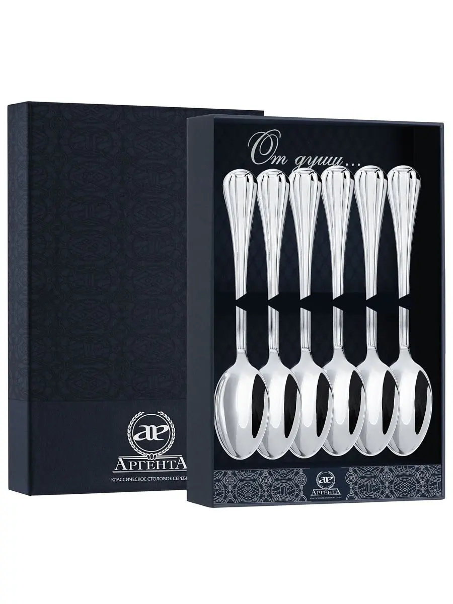 ОТ ДУШИ! - это ваш ключ к идеальному подарку. Постоянно растущая коллекция очаровательных серебряных сувениров и подарков состоит из множества чайных ложечек и ситечек для чая, зажимов для купюр и закладок для книг, ионизаторов воды, брелоков и новогодних символов. Каждый товар поставляется в красивом фирменном футляре и уже выглядит как готовый подарок, который точно порадует и станет приятным сюрпризом для близкого человека, друга, коллеги или просто кого-то особенного. В набор входит 6 чайных ложек, изготовленных из серебра 925 пробы, длина ложки 15,2 см, примерный вес ложки 31 г, вес набора 186 г. Набор упакован в подарочный футляр.