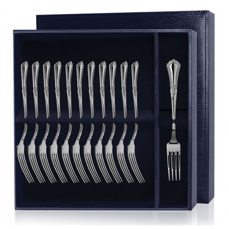 Серебряный набор "Фаворит" - это 12 столовых вилок, сделанных из серебра 925 пробы. Отличительной особенностью столовых вилок серебряного комплекта являются искусные узоры по краям рукояток, которые придадут праздничную атмосферу застолью или торжественному столу.