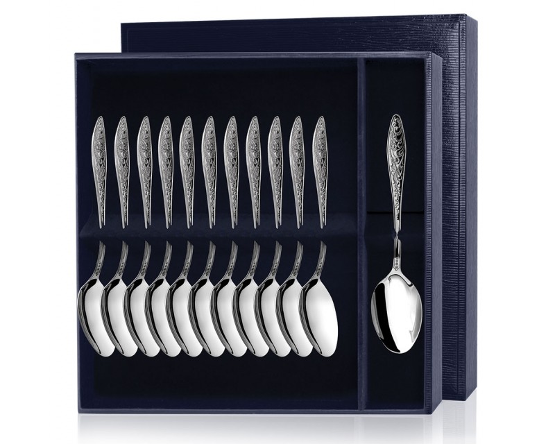 В серебряный набор "Морозко" входит 12 десертных ложек. Великолепные, тонко выполненные узоры украшают всю поверхность рукояток предметов. Все ложки изготовлены из серебра 925 пробы.
