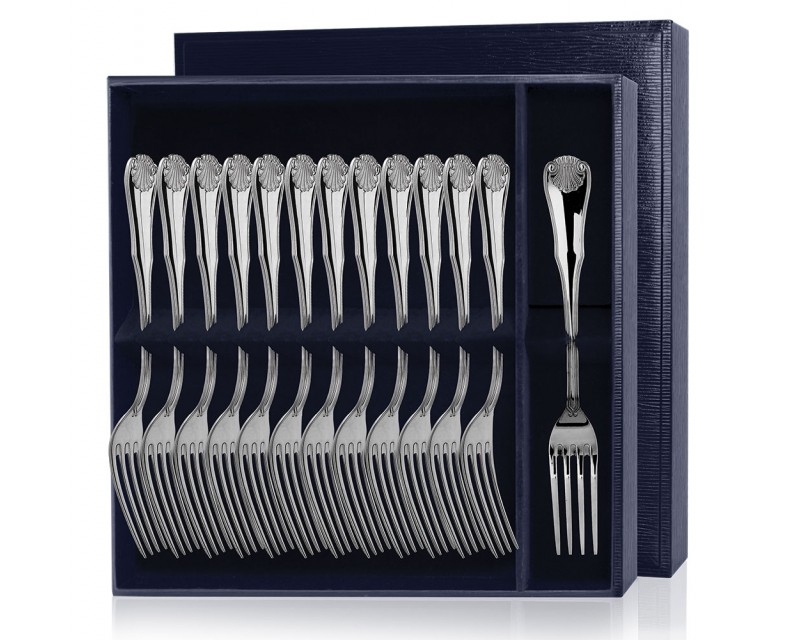 Серебряный набор "Визит" - это 12 столовых вилок. Предметы сделаны из высококачественного серебра пробы 925. Выполнены искусными мастерами на фабрике "Аргента". Рукоятки вилок покрыты элегантным витым узором в стиле барокко.