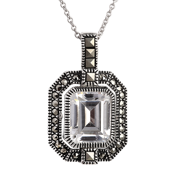 Кулон выполнен из серебра 925 пробы, инкрустирован фианитом и искрящимися марказитами Swarovski. Размер 2,5,5 см*2 см с ушком, длина цепочки 45 см.