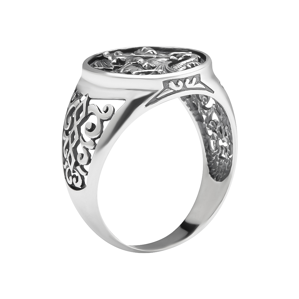 Ищете солидное мужское украшение с глубоким смыслом? Представляем серебряное кольцо‑перстень из серебра 925‑й пробы с изображением Георгия Победоносца — сочетание изысканного ювелирного исполнения и мощного духовного символа.