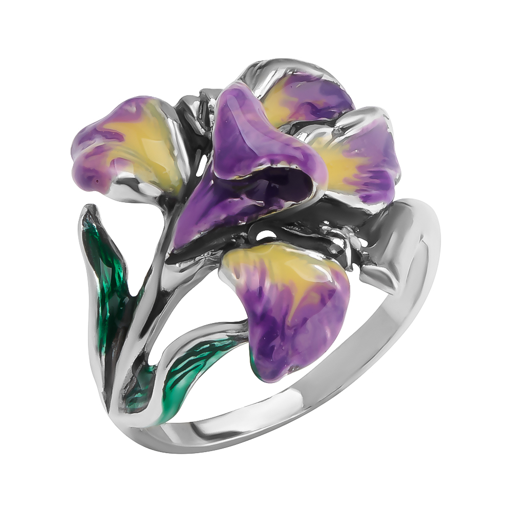 Изящное серебряное кольцо с эмалевым изображением цветка ириса — гармоничное сочетание ювелирного мастерства и художественной эстетики. Это украшение воплощает природную красоту в миниатюре и станет выразительным акцентом вашего образа.
