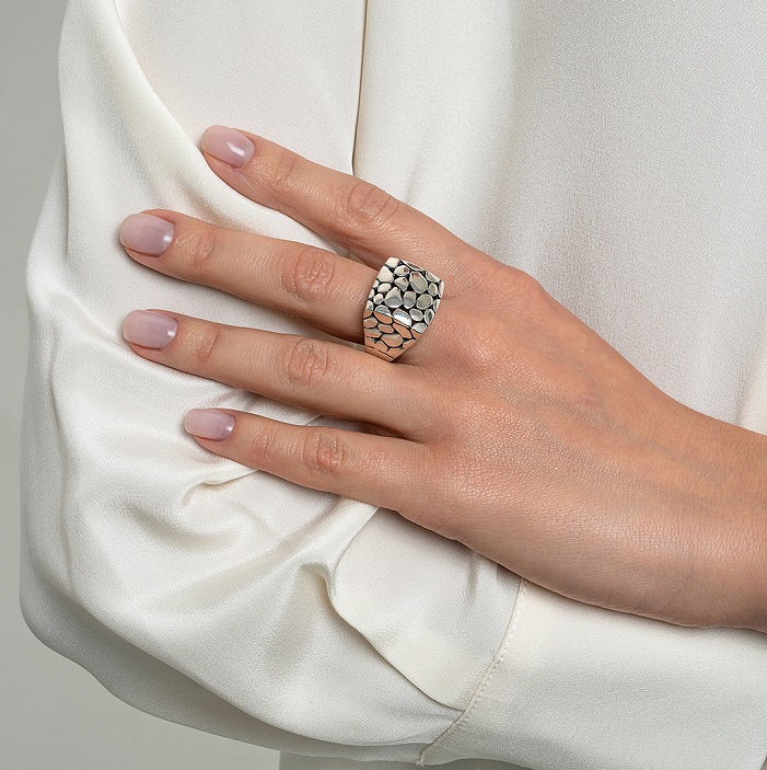 Кольцо «Мозаика», изготовленное из высококачественного серебра, подчеркнет естественную красоту ваших рук и гармонично дополнит любые, даже самые необычные образы.