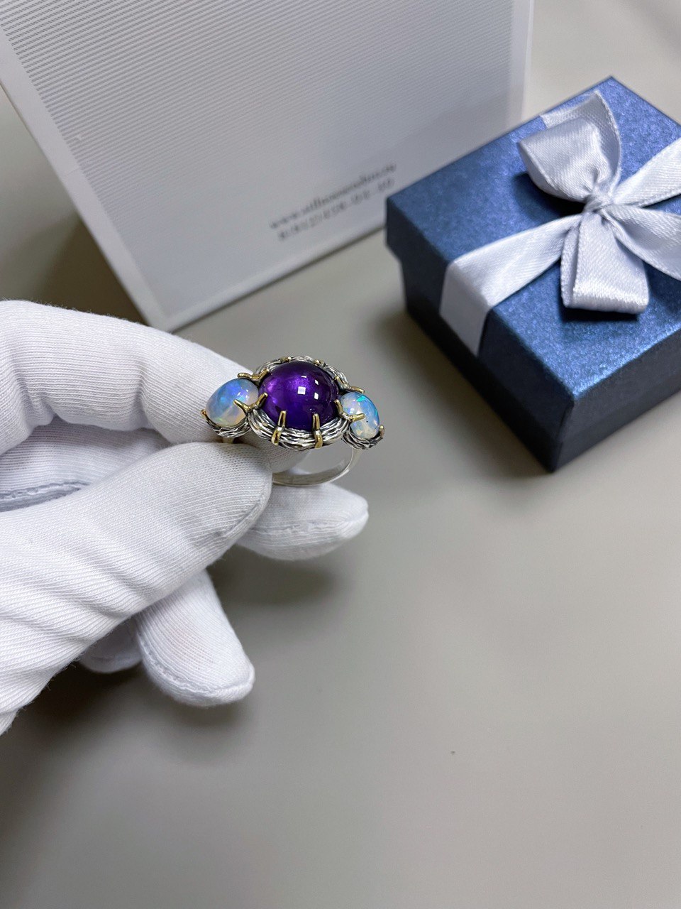 Эффектный контраст как по цвету, так и по текстуре: сочетание аметиста и опала в кольце «Триада» подчеркнут креативный вкус своего обладателя.