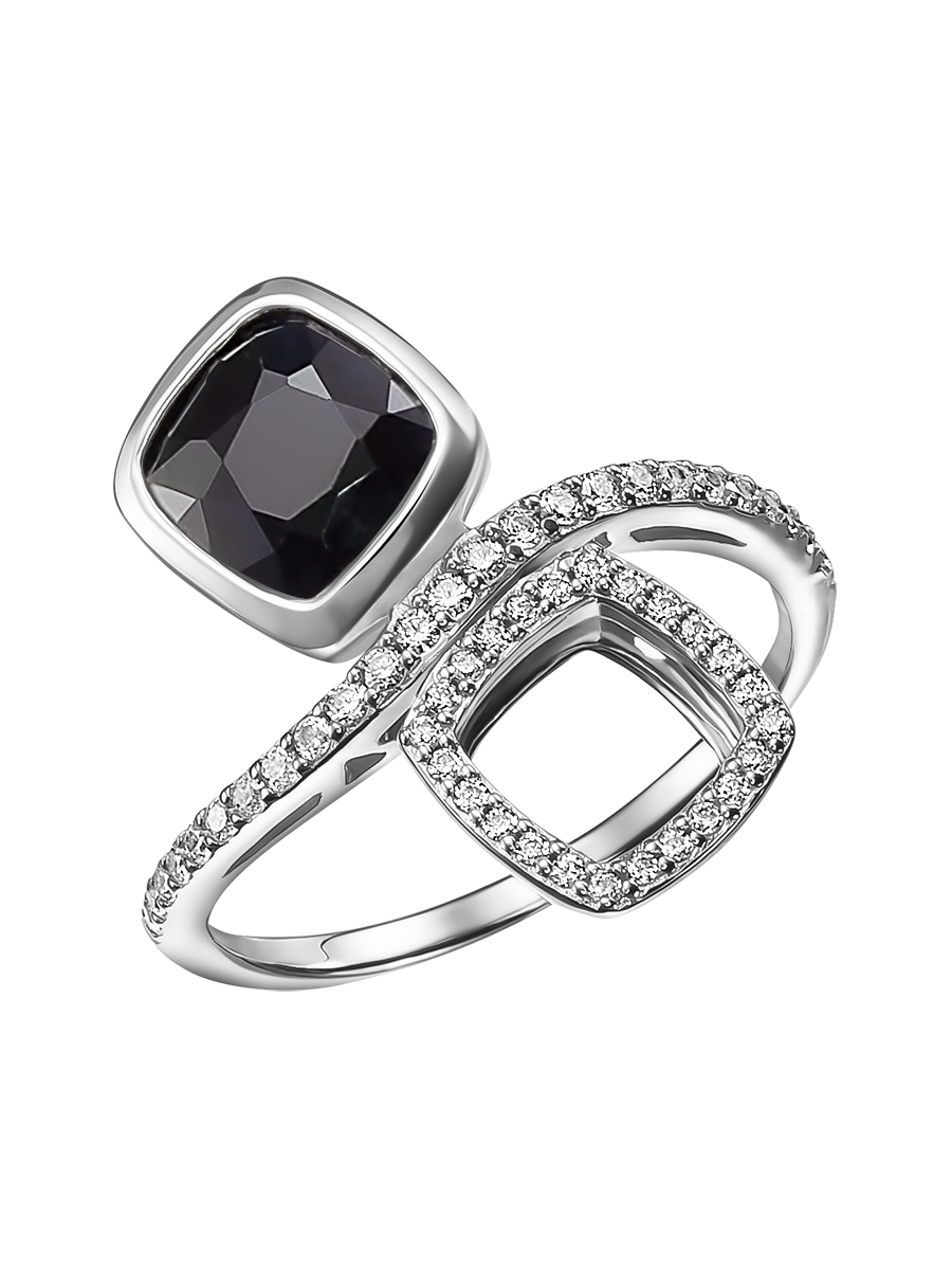 В этом украшении сапфир глубокого насышенного синего цвета. Под определеным углом можно увидет темно-серый, темно-синий, иссине-черный оттенки.