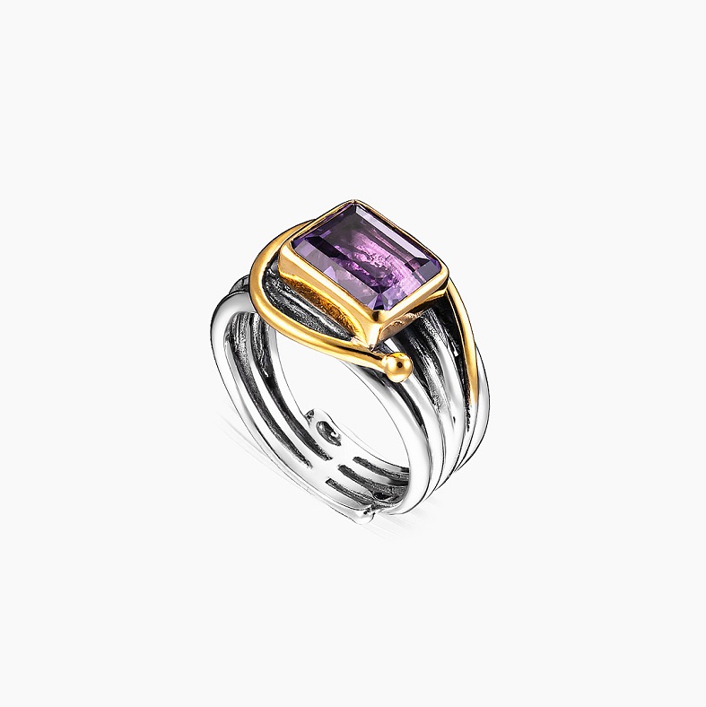Аметист прямоугольной огранки и позолоченная витиеватая деталь — эффектный контраст цвета и формы придает кольцу фактурный характер.