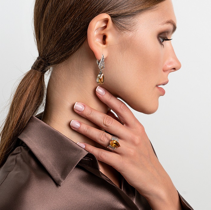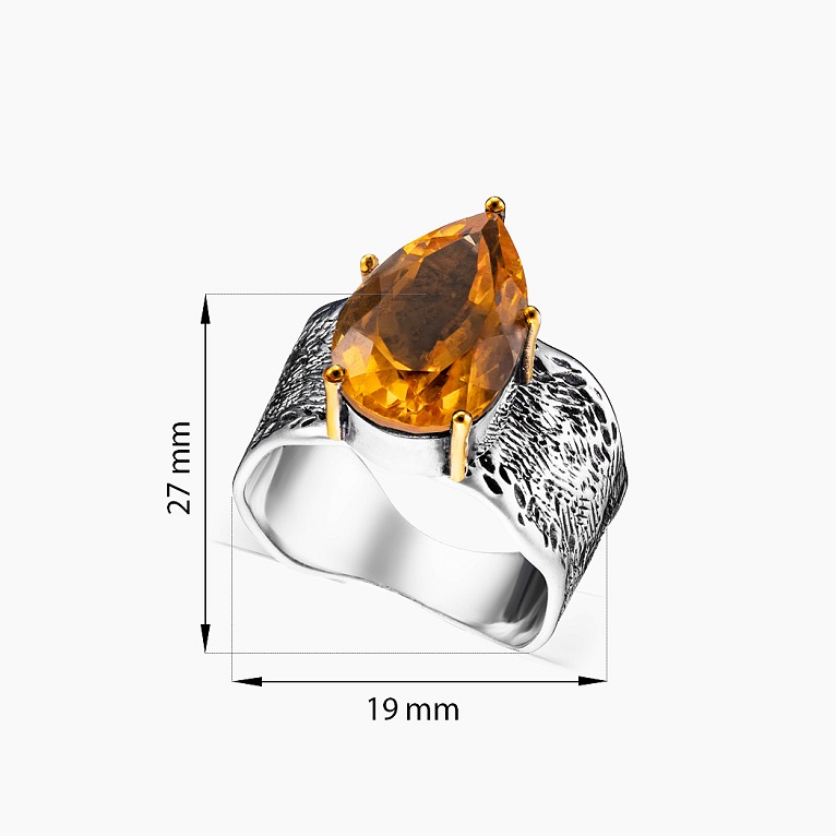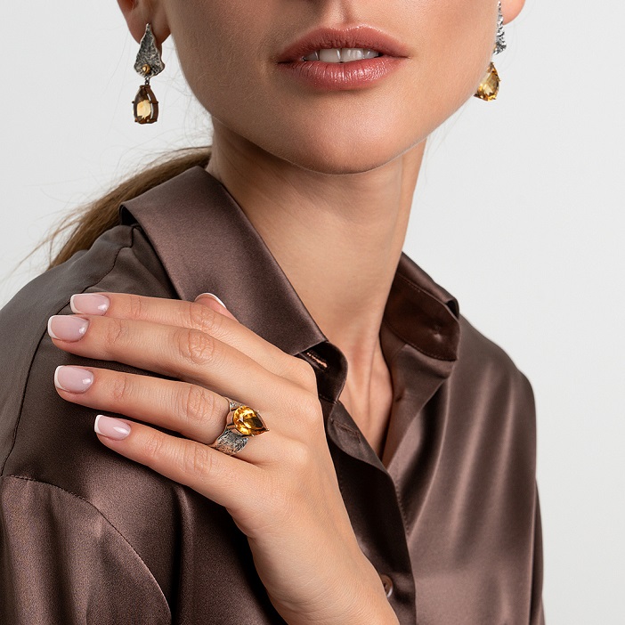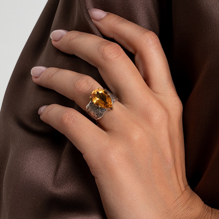 Кольцо «Медовый лист» — яркий акцент для вечерних образов, особенно в сочетании с длинными платьями и деловыми костюмами.