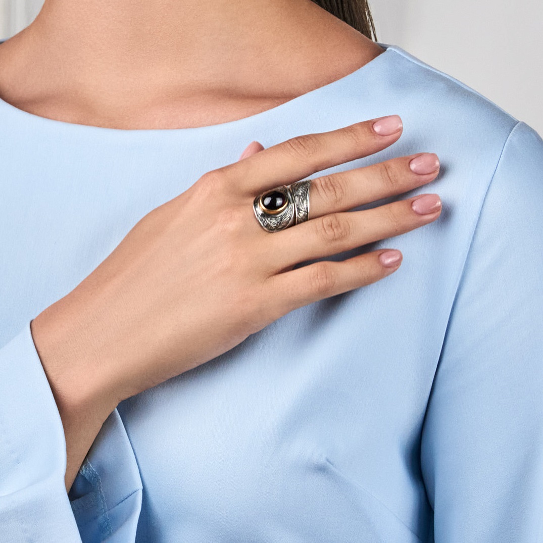 Откройте для себя кольцо «Мистический Гранат» и погрузитесь в таинственный мир украшений с коллекцией фактурных изделий. Отлично сочетается с классическими костюмами и вечерними платьями.