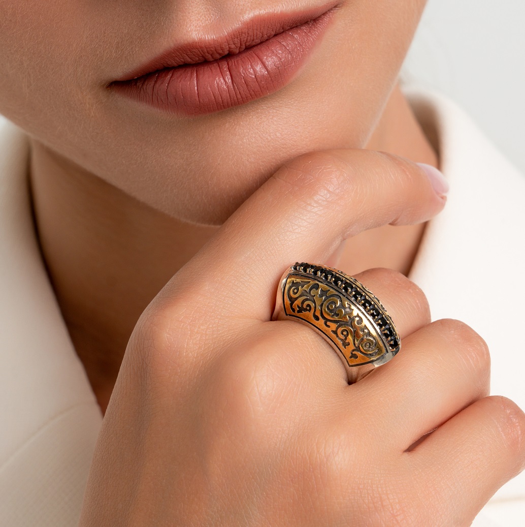 Шпинель, серебро и позолота — фактурный орнамент, изысканный дизайн. Кольцо «Восточная Фантазия» прекрасно дополнит вашу базовую коллекцию ювелирных украшений.