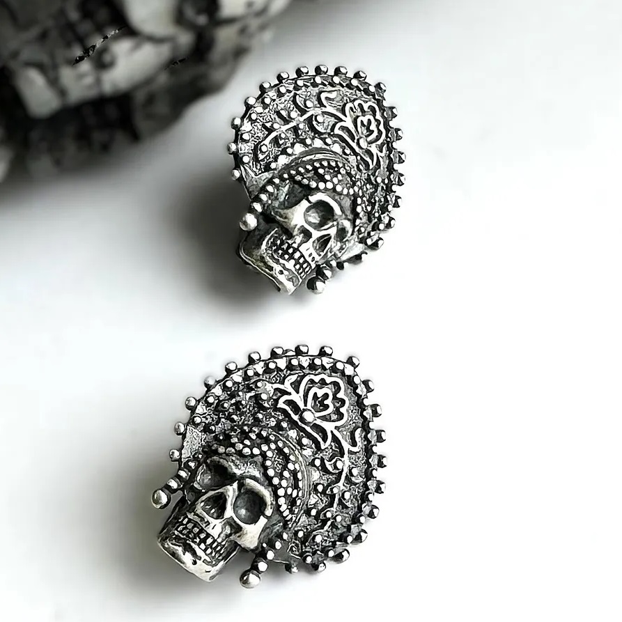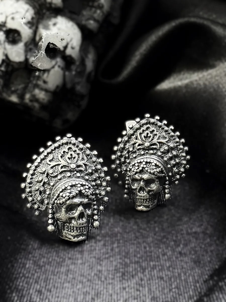 Откройте для себя уникальное украшение, где мрачная эстетика черепов переплетается с традиционными мотивами русского кокошника. Эти авторские серьги из серебра 925‑й пробы станут ярким акцентом в образе ценителей тёмной романтики и альтернативной моды.