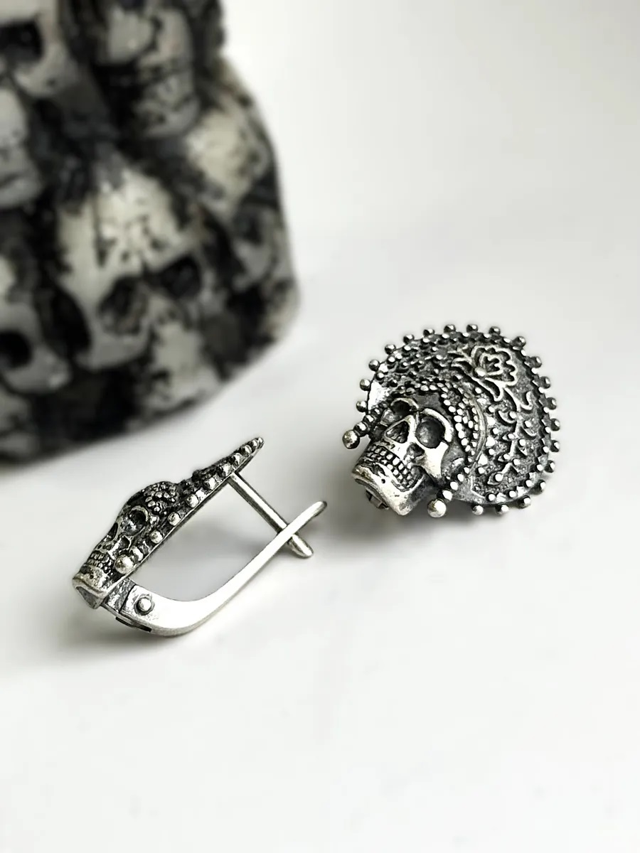 готические серьги, серьги с черепом, серебряные серьги 925, оксидированное серебро, авторские украшения, тёмная романтика, украшения в русском стиле, серьги с кокошником, альтернативная мода, эксклюзивные серьги, винтажные украшения, серьги для хэллоуина, необычные серьги, этнические мотивы в ювелирке, серебряные украшения с черепом.