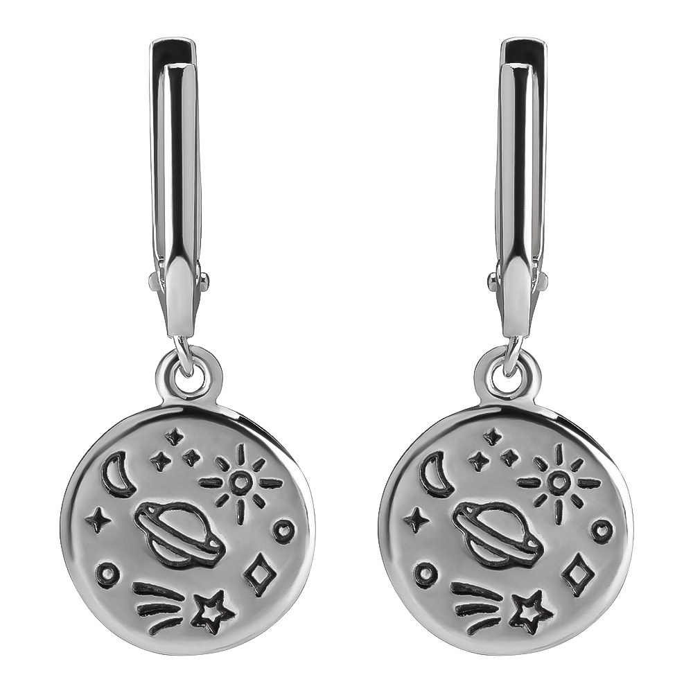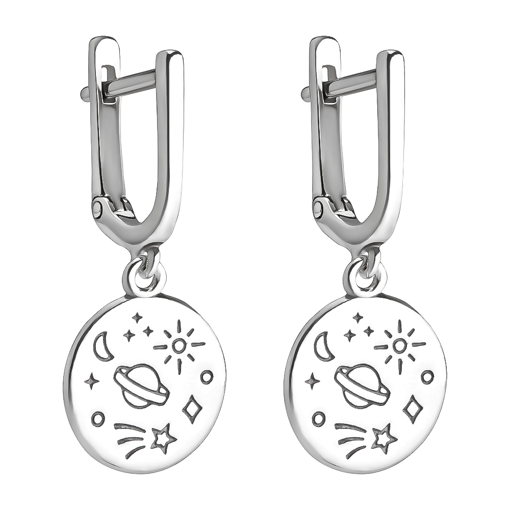 Дизайн: минималистичные серьги с детализированным изображением космоса (звёзды, планеты, галактики).