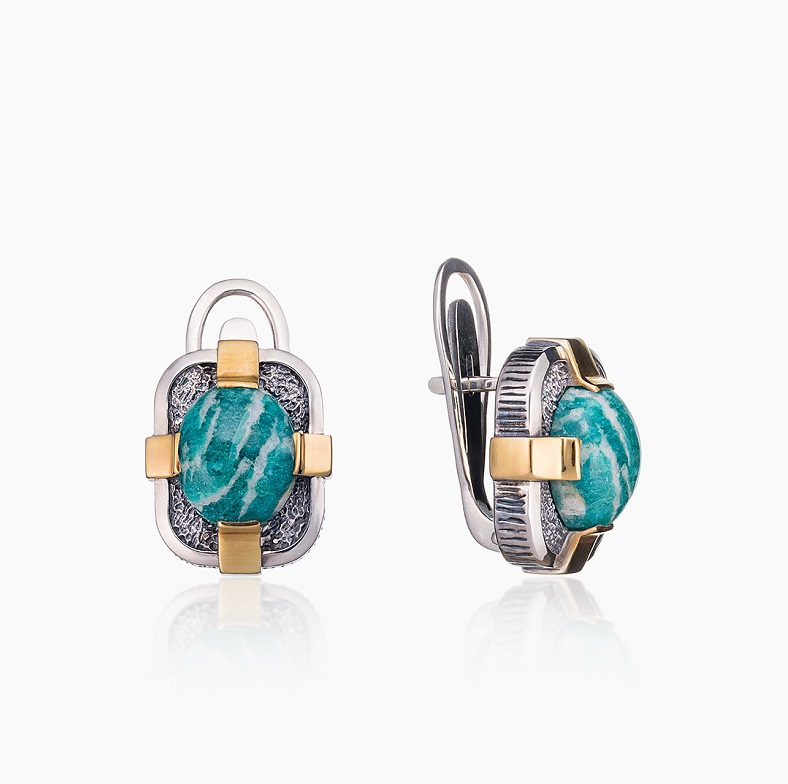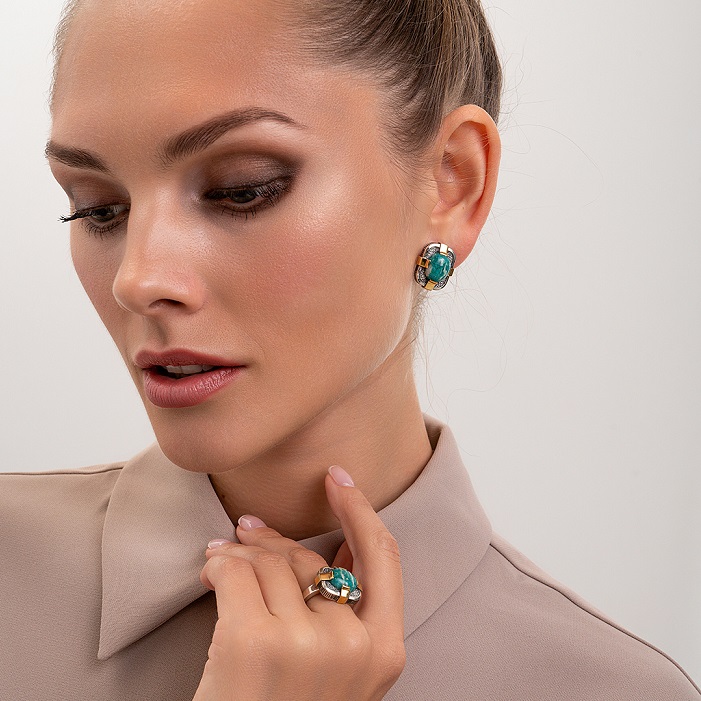 Зеленовато-голубой камень в обрамлении фактурного серебра создан добавить больше уверенности в каждый прожитый день. Универсальны — можно сочетать как с деловыми костюмами, так и с вечерними нарядами.