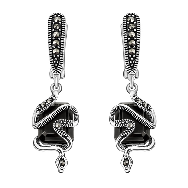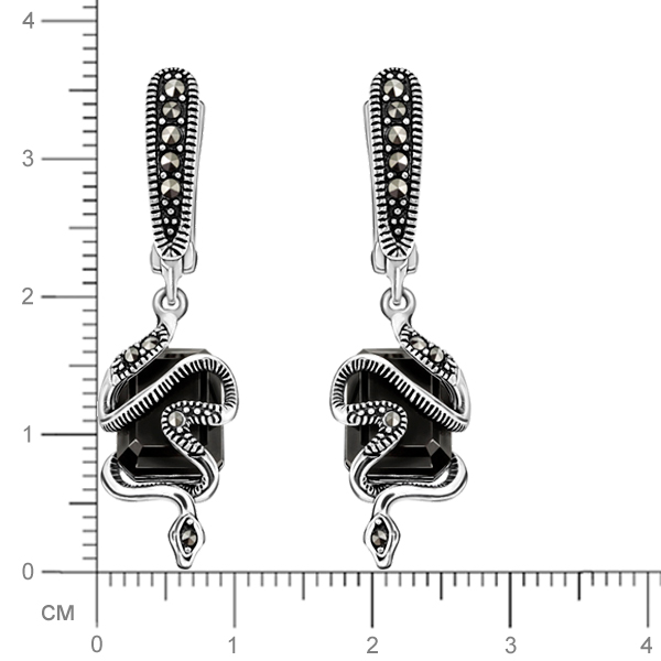 Серьги выполнены в виде змеи, обвивающей камень. Размер - 3,7 см. Надежный английский замок также украшен марказитами.