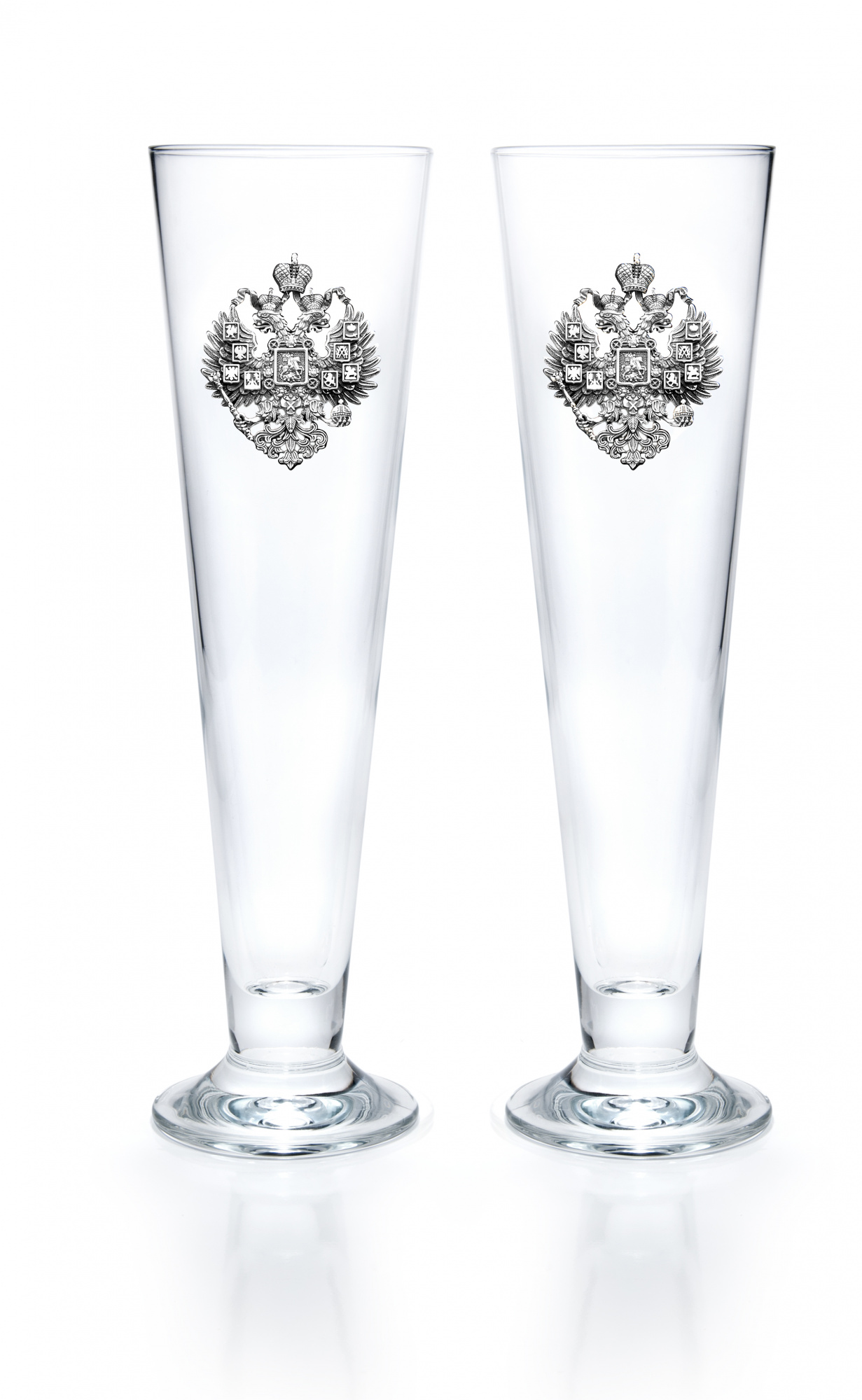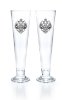 Каждый бокал, вмещающий 500 миллилитров, украшен гербом царской России ручной работы.