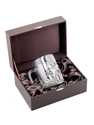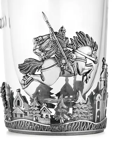 Премиальная кружка для чая «Богатырская сила» выполнена из термостойкого стекла с двойными стенками и серебра.